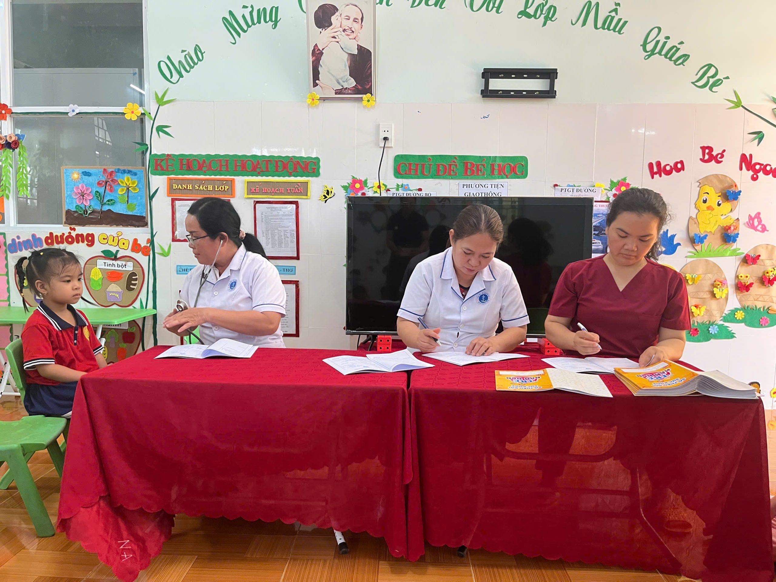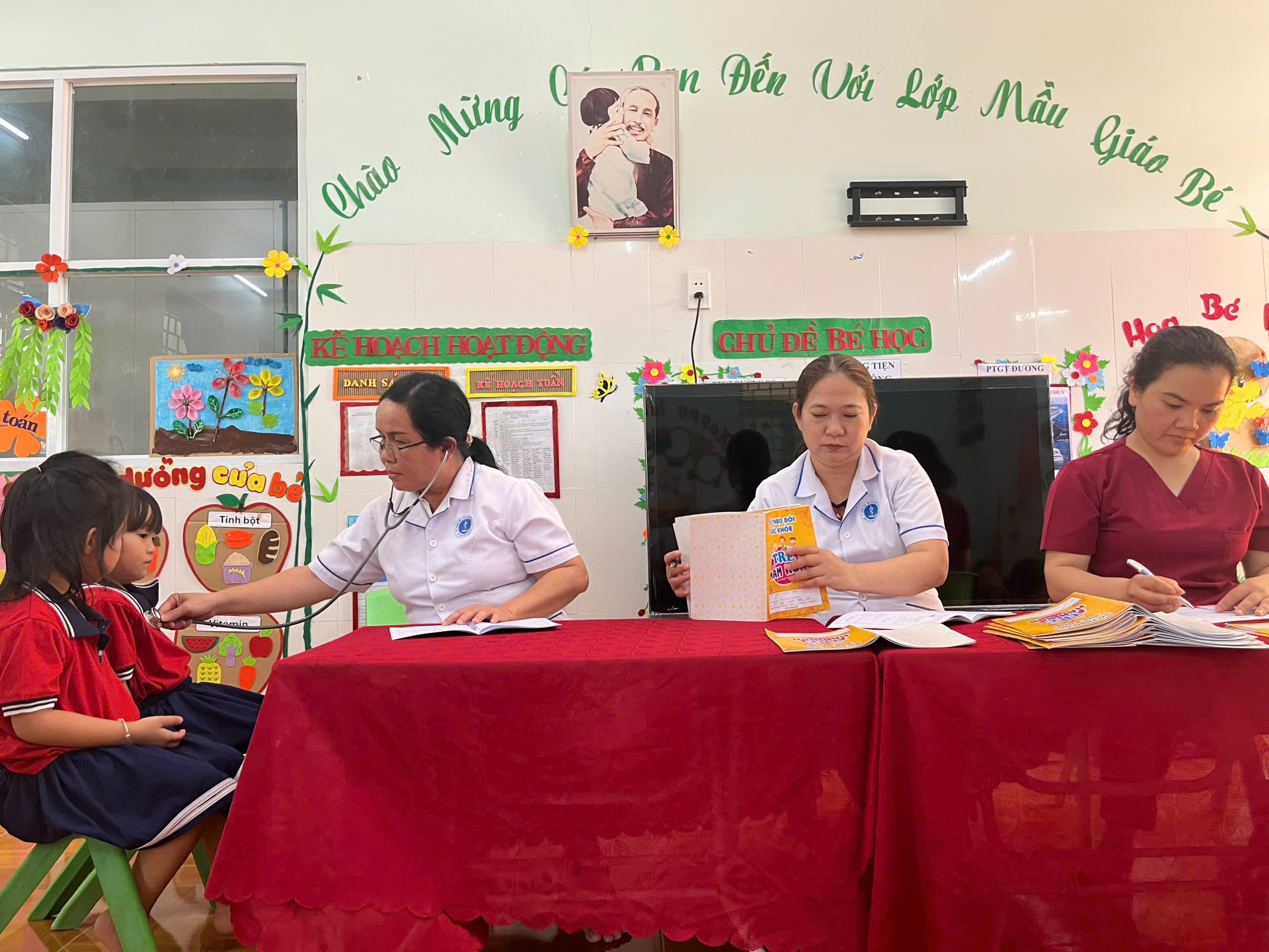Thực hiện Kế hoạch nhiệm vụ năm học 2025- 2026, kế hoạch tháng 3/2026. Ngày 24/3/2026 trường Mầm non Bình Tân Phú đã phối hợp với trạm y tế xã Đông Sơn, tổ chức khám sức khoẻ định kỳ lần 2 cho 10/10 nhóm lớp. Nội dung khám, kiểm tra: khám tai, mắt, mũi, họng, răng, kiểm tra tim phổi và một số bệnh liên quan đến đường hô hấp, da liễu.